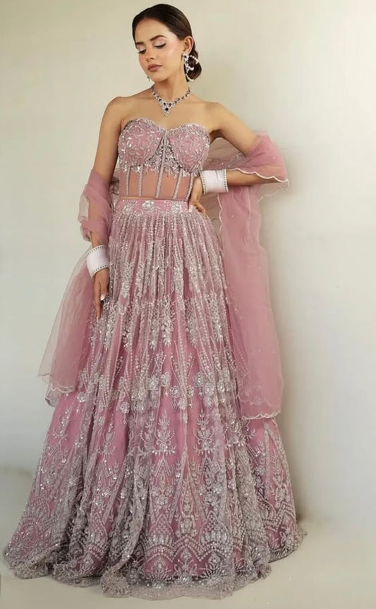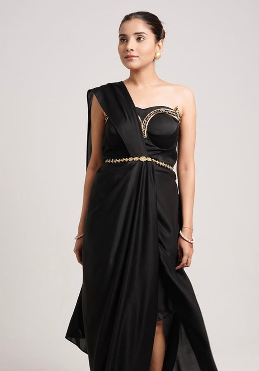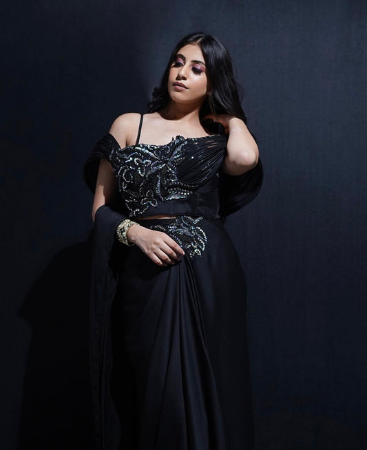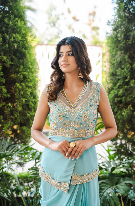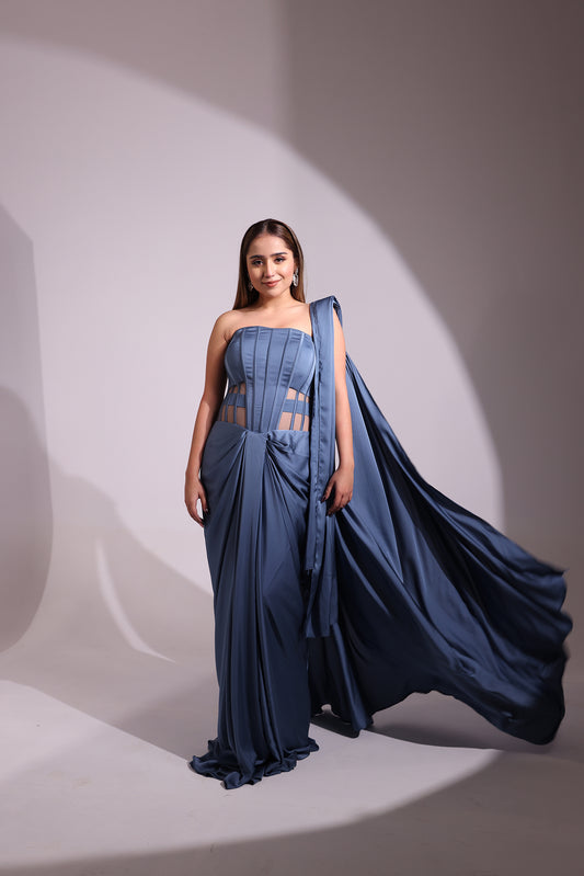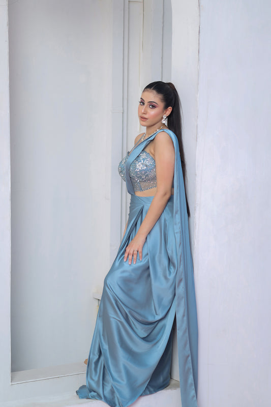 BLUISH GREY EMBELLISHED CORSET BLOUSE WITH COWL DRAPE SKIRT