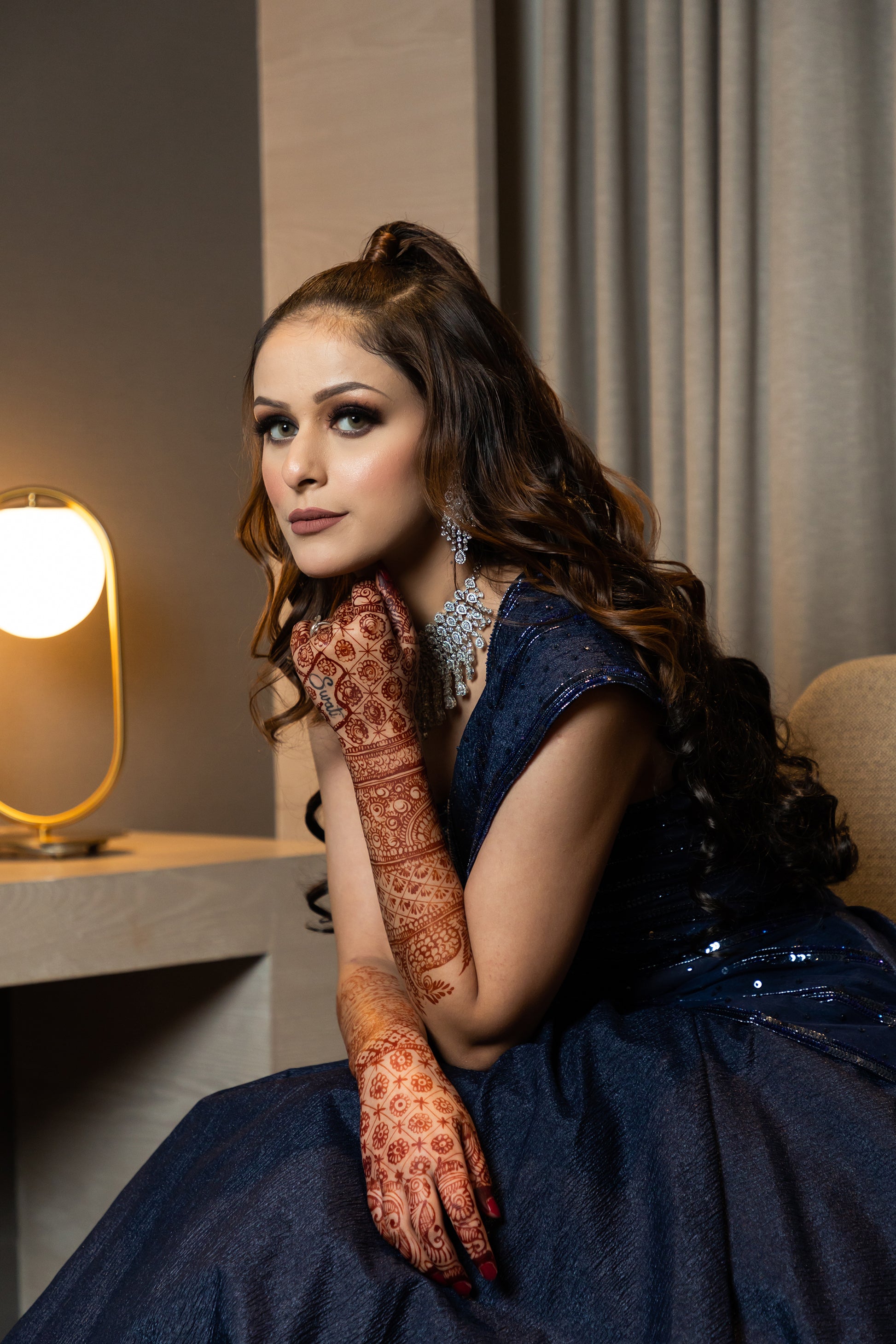 Midnight blue flap gown, layered with fabric, and embellished with sequence and cut dana. It has a flap on one side